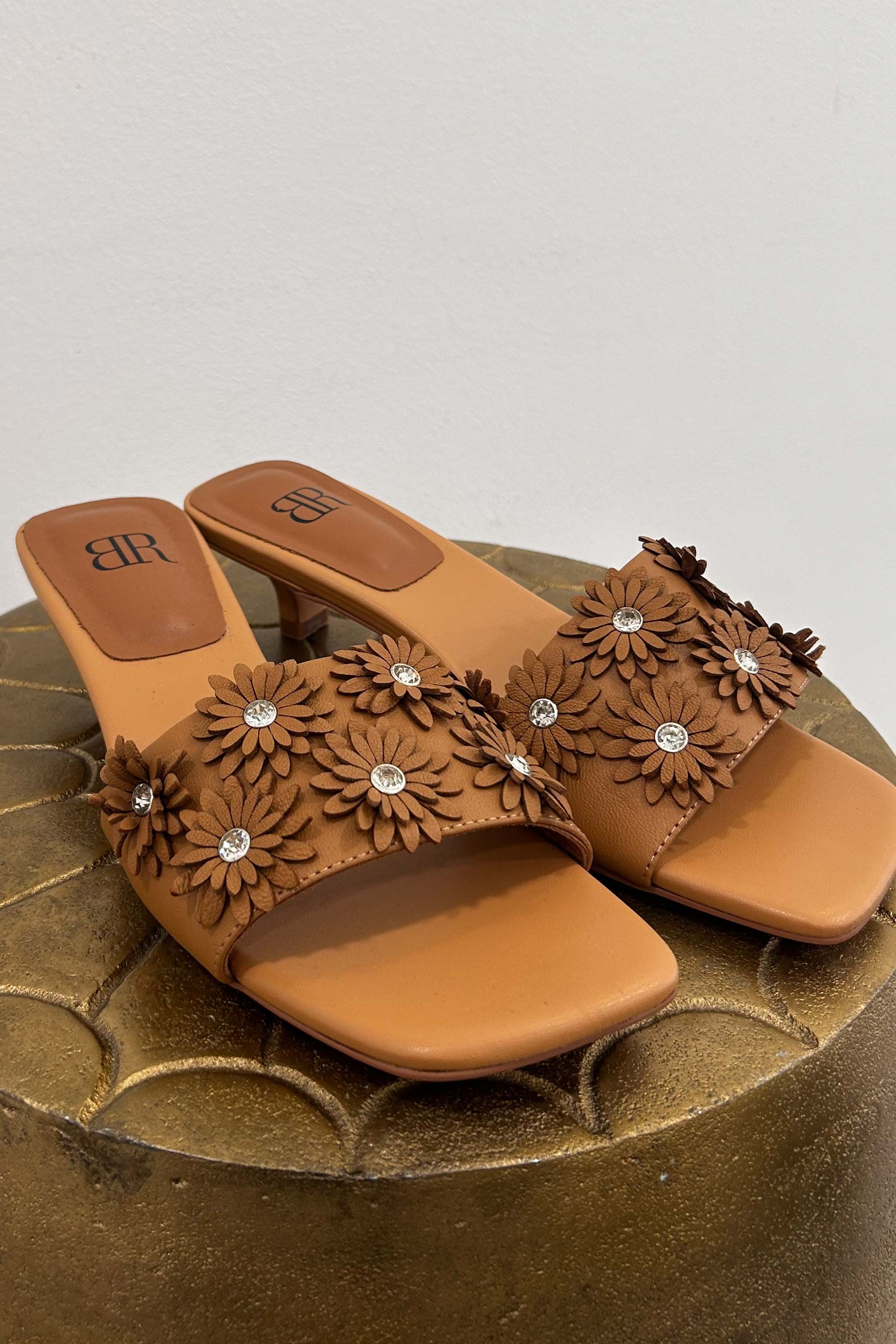 Exklusive Slip-In Sandale aus edlem Leder mit eckiger Spitze, kleinem Absatz und schöner Blütenverzierung