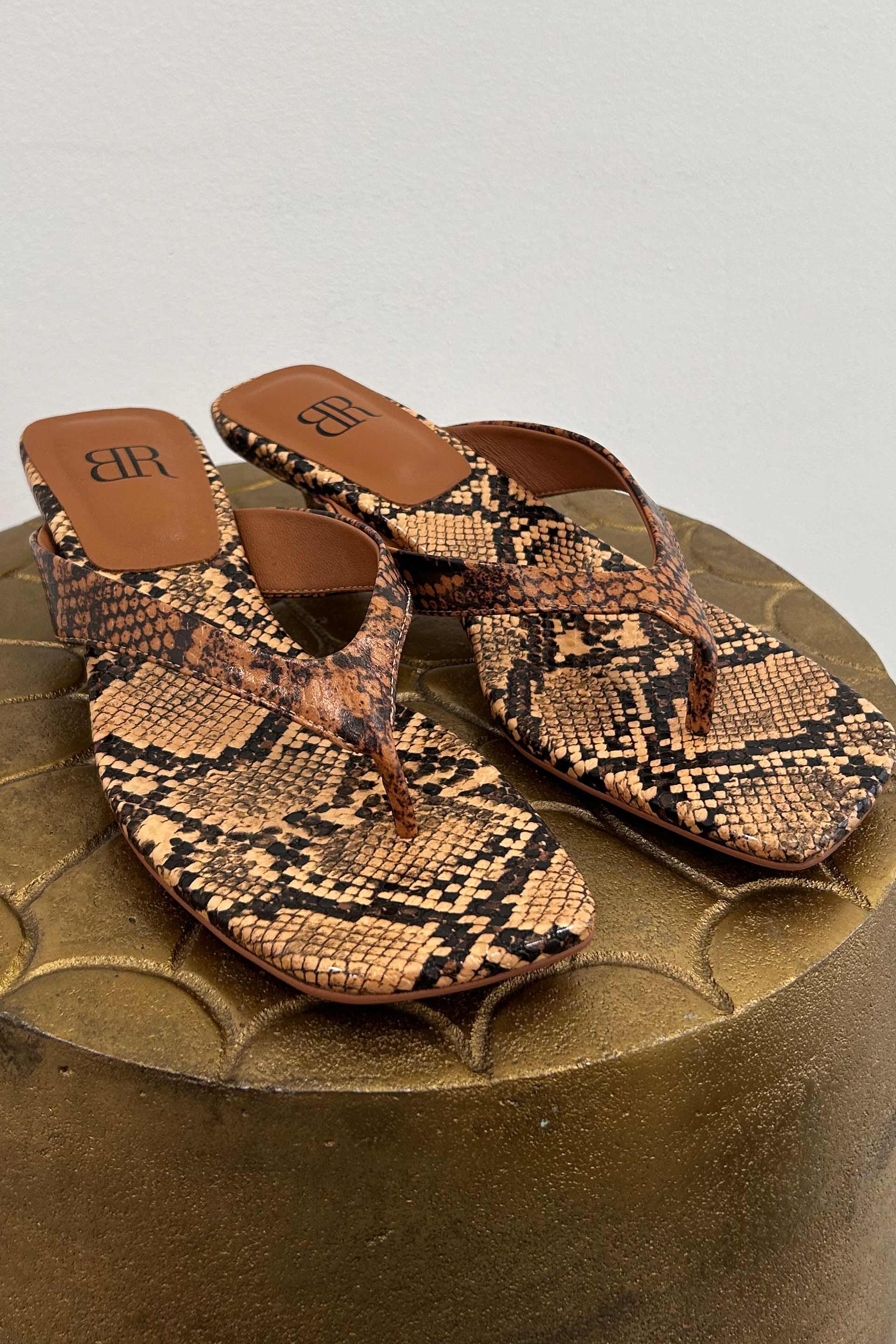 Exklusive Slip-In Sandale aus edlem Leder mit eckiger Spitze, kleinem Absatz und lässigem Schlangenmuster