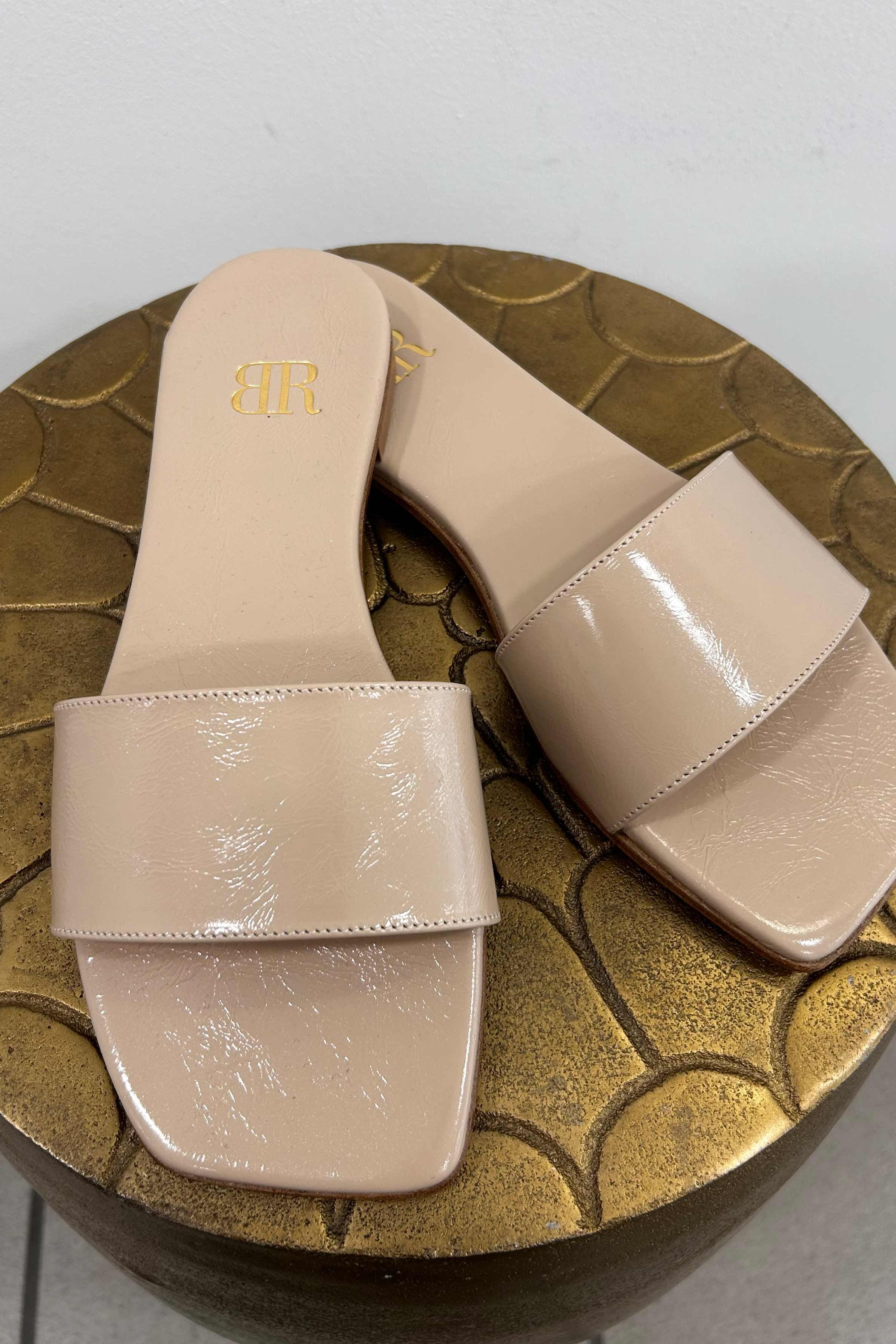 Exklusive Slide-Sandale aus edlem Lack-Leder mit eckiger Spitze und flachem Absatz