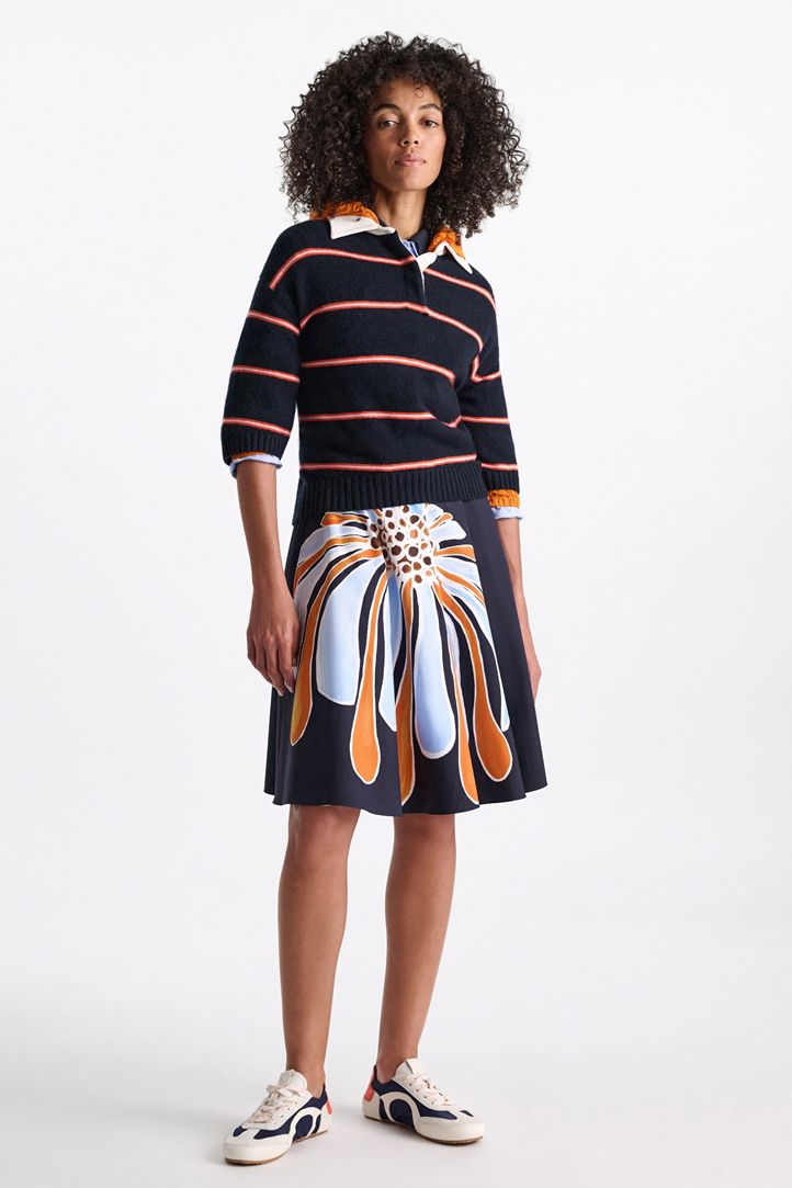 Entspannt fallender, Boxy Fit Pullover im supersoften Schurwoll-Kaschmir Mix mit kontrastierendem Polokragen und kurzer Knopfleiste, überschnittener Schulter, ellenbogenlange Arme, Rippbündchen an den Abschlüssen sowie schönem, zweifarbigem Streifenmuster