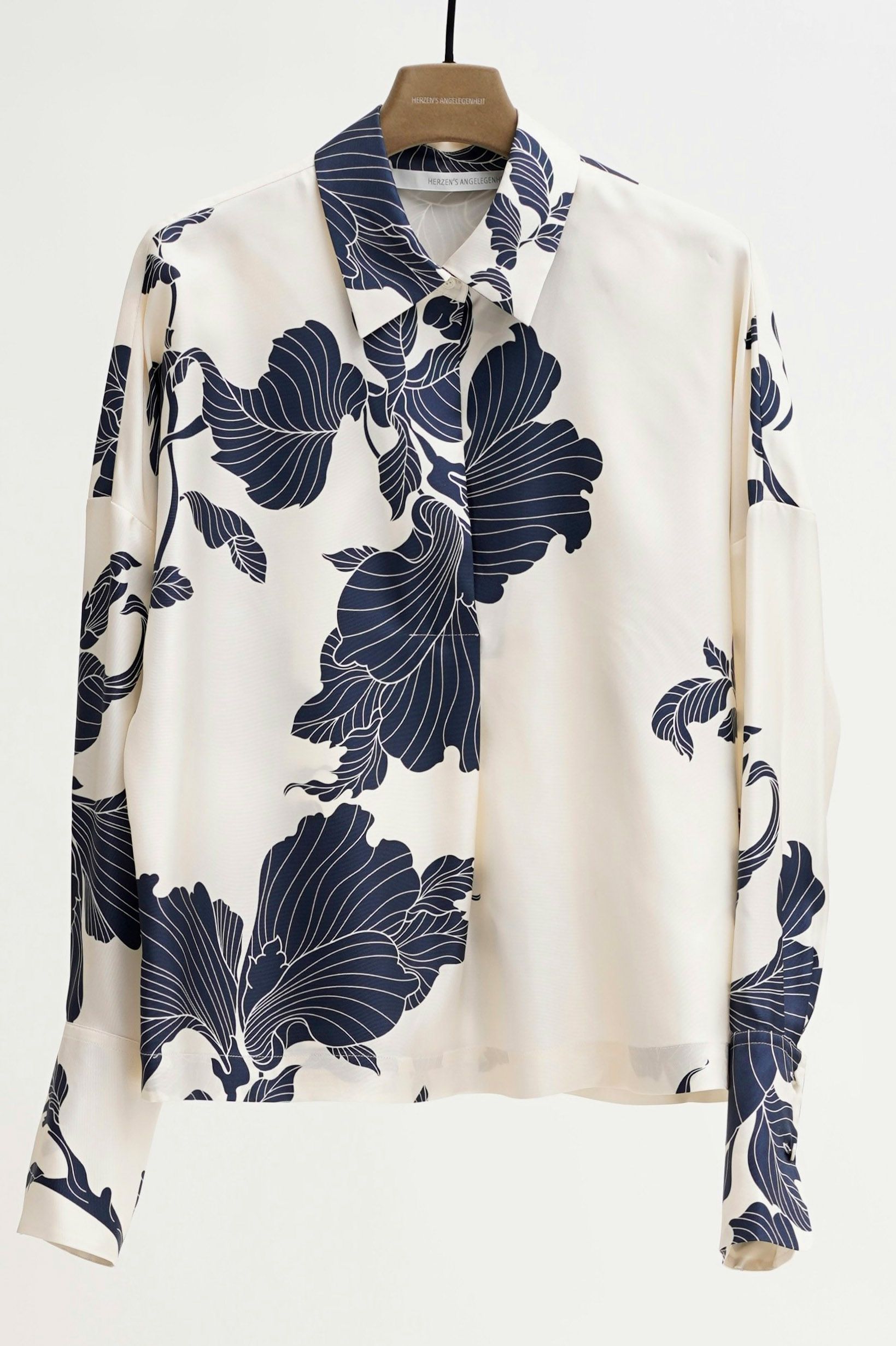 Locker geschnittene, leicht kastig fallende Hemd-Bluse aus reiner Seide mit Umlegekragen, verdeckter, halblanger Knopfleiste, hoher Ärmelmanschette und schönem Floral-Print