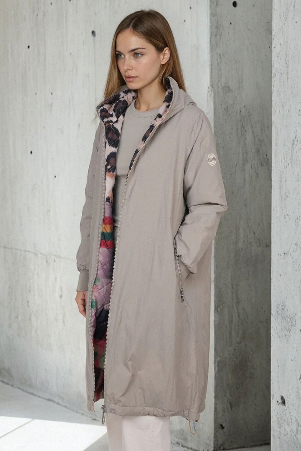 Vielseitig, wandelbare 2in1 Wende-Mantel aus leichter Nylonware mit wattierter Füllung, weiter Kapuze, durchgehendem Doppelzipper, überschnittener Schulter, seitlichen Eingriffs-Taschen, elastischem Tunnelzug-Saum sowie minimalistischer Optik auf der einen und ausdrucksstarkem Leo-Multi-Print auf der anderen Seite