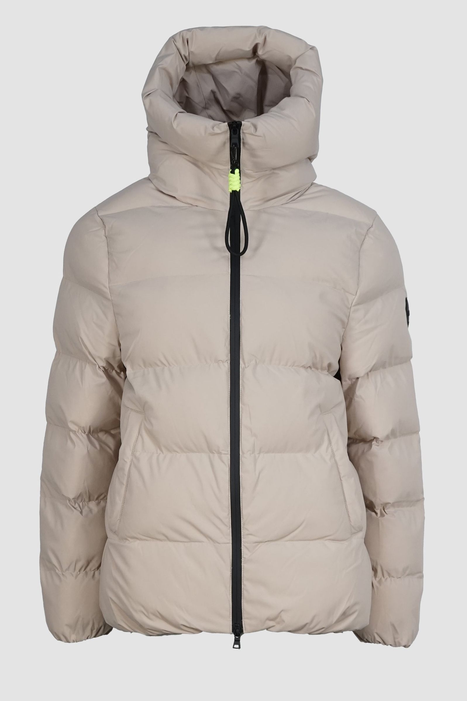 Gerade geschnittene Jacke aus winddichter, wasserabweisender Nylonware mit dicker, warmer Wattierung, hoch verschließbarem Kapuzenkragen, durchgehendem 2-Wege Zipper, seitlichen Eingriffstaschen und gerafften Säumen