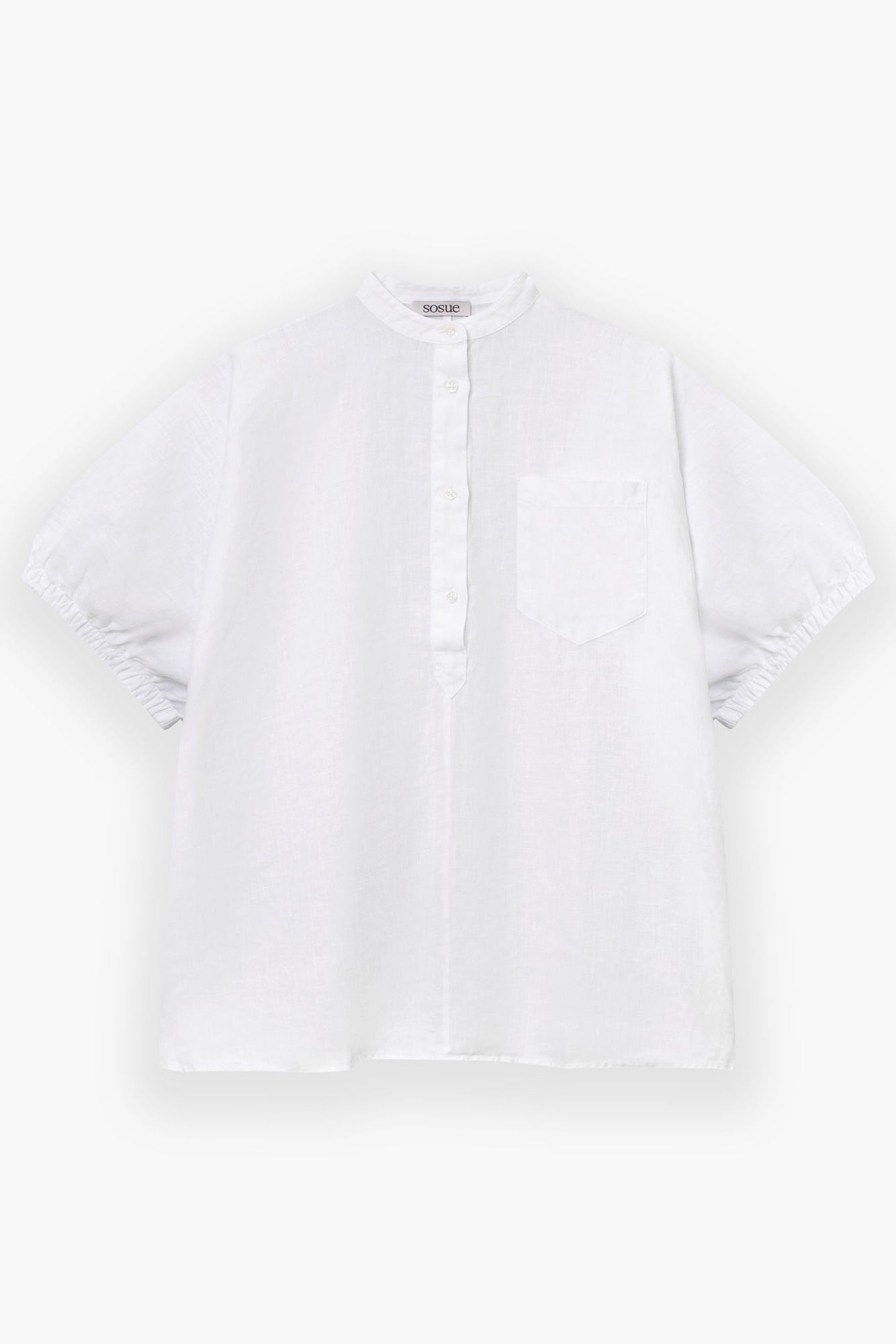 Locker fallende Kurzarm-Bluse aus leichtem Baumwoll-Voile mit kleinem Stehkragen, elastischem Bund an den weiten Ärmeln, halblanger Knopfleiste und aufgesetzter Brusttasche